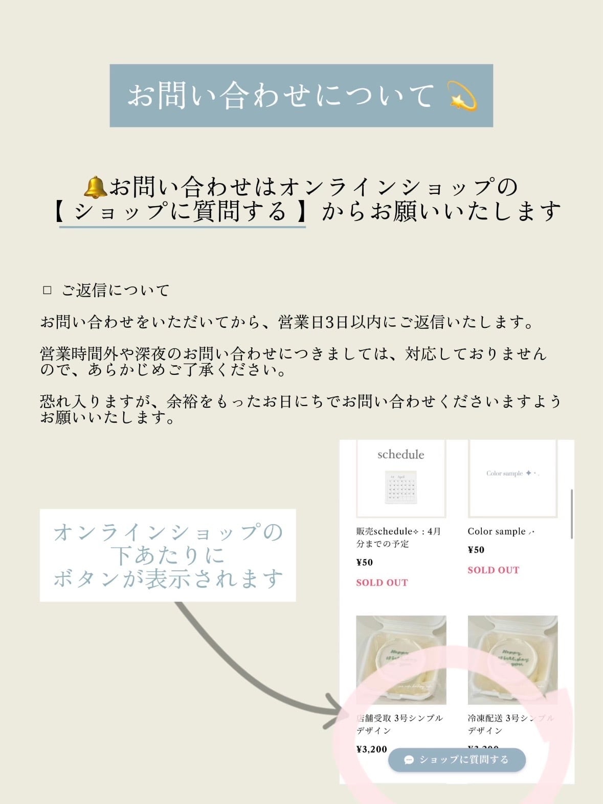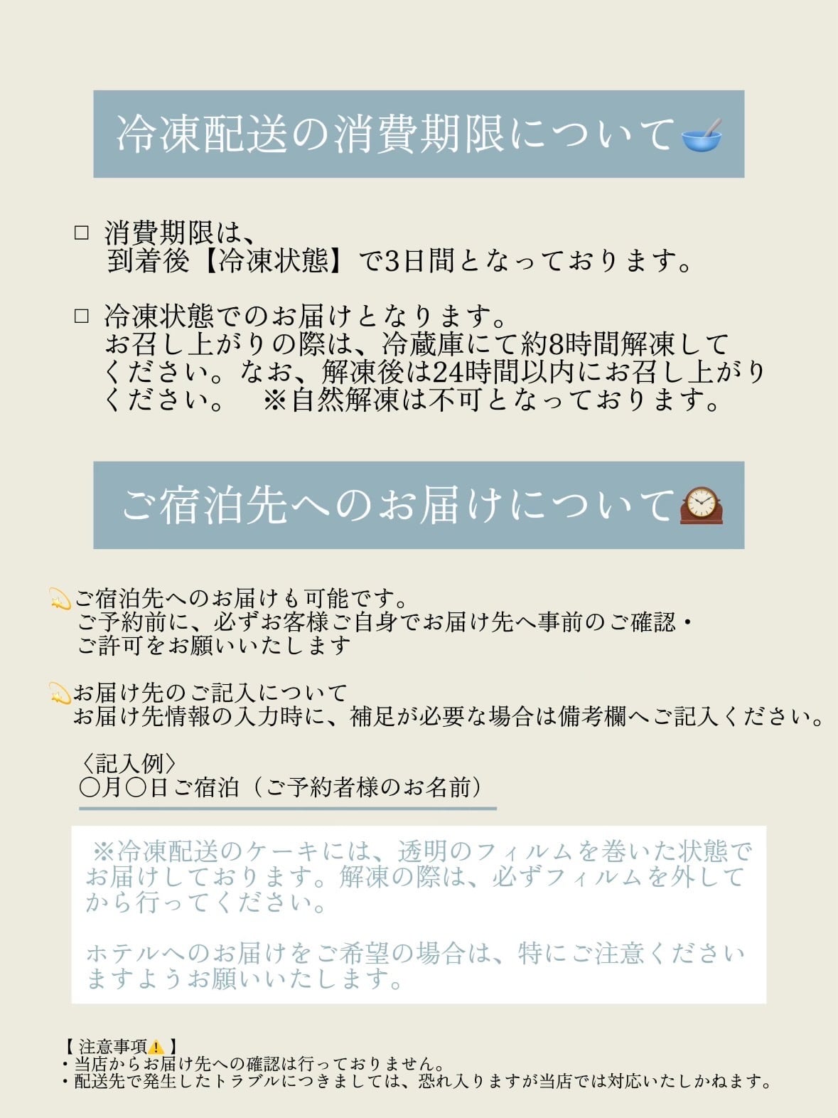 当オンラインショップ内の【冷凍配送ケーキをご購入のお客様へ ⸝⋆|ご購入前に必ずご一読ください】のページに、大切なご案内を記載しております。