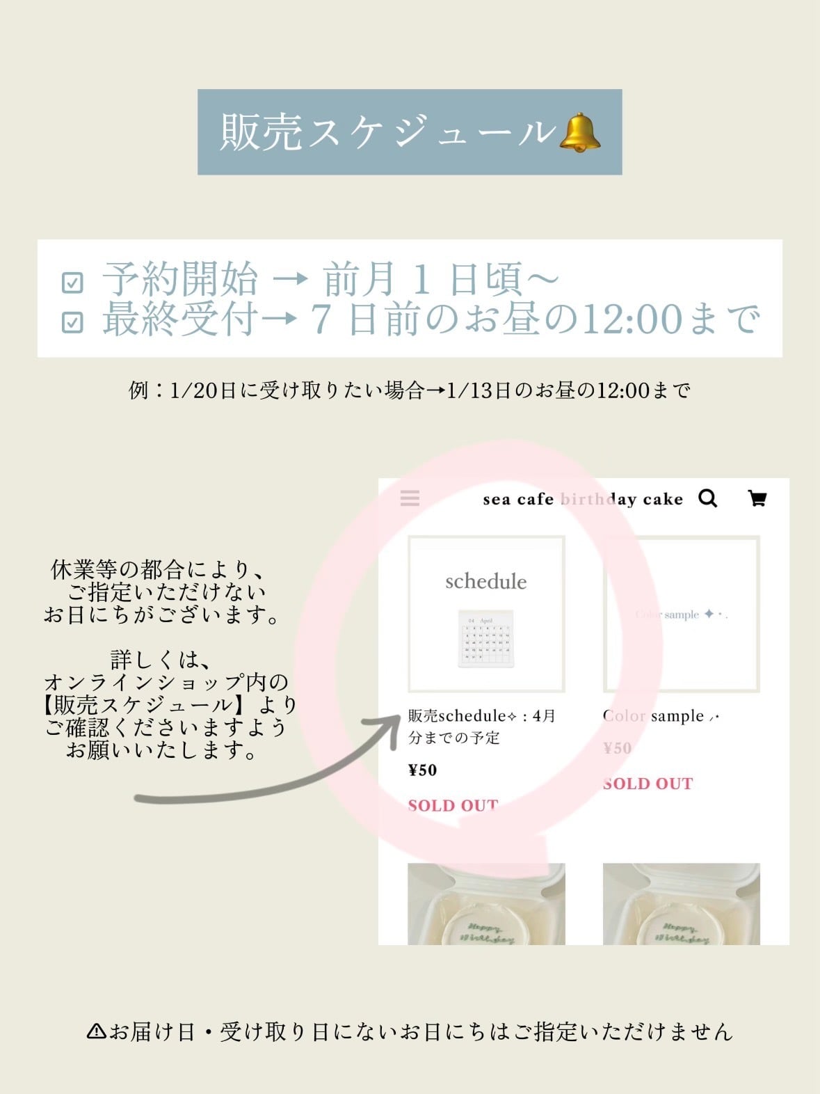 当オンラインショップ内の【冷凍配送ケーキをご購入のお客様へ ⸝⋆|ご購入前に必ずご一読ください】のページに、大切なご案内を記載しております。