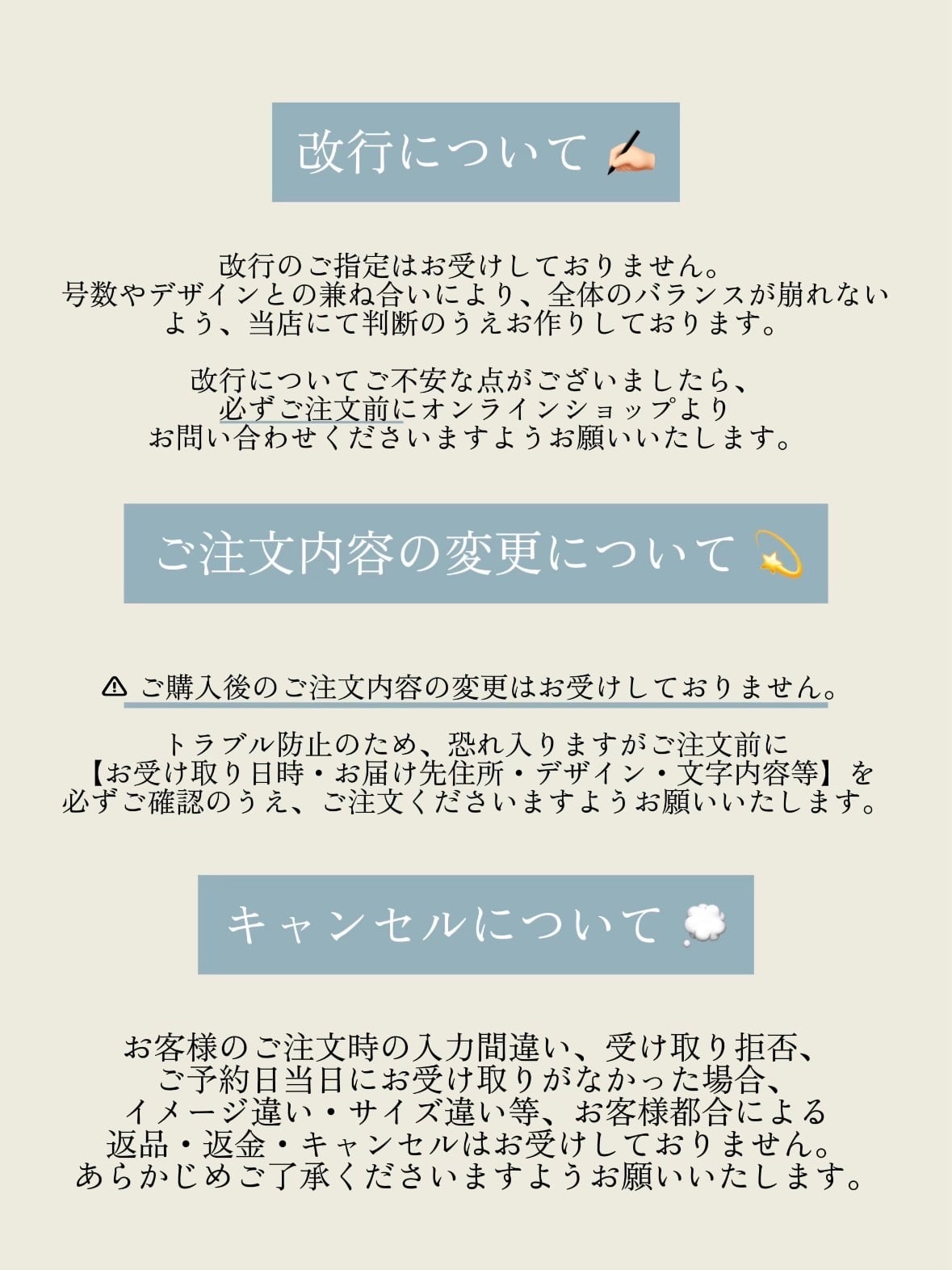ご購入後のご注文内容の変更およびキャンセルは、一切お受けしておりません。ご注文前に、受け取り日・受け取り時間・デザイン・文字内容等を必ずご確認くださいますようお願い申し上げます。