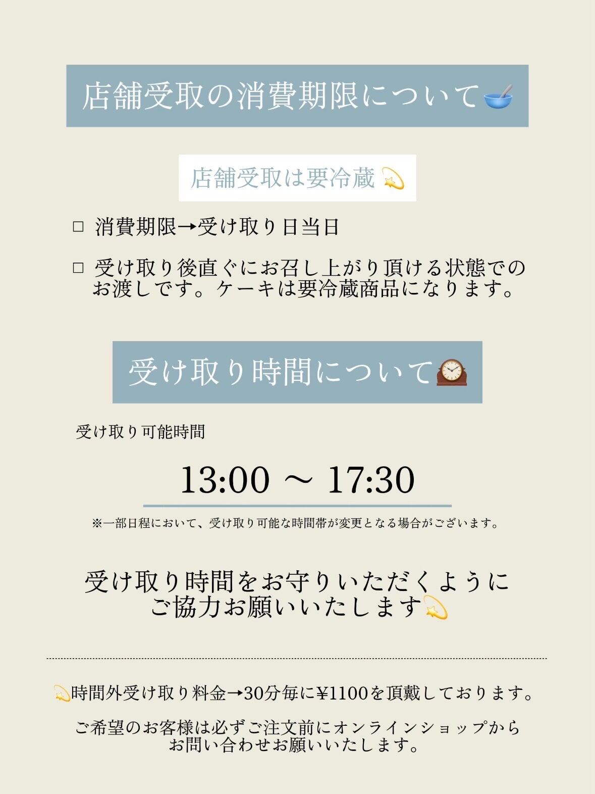 当オンラインショップ内の【店舗受取ケーキをご購入のお客様へ ⸝⋆|ご購入前に必ずご一読ください】のページに、大切なご案内を記載しております。