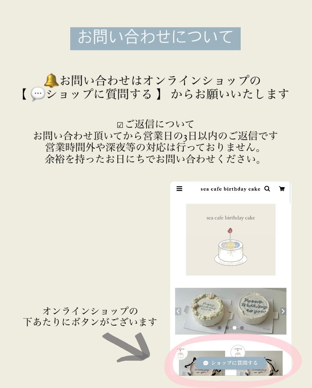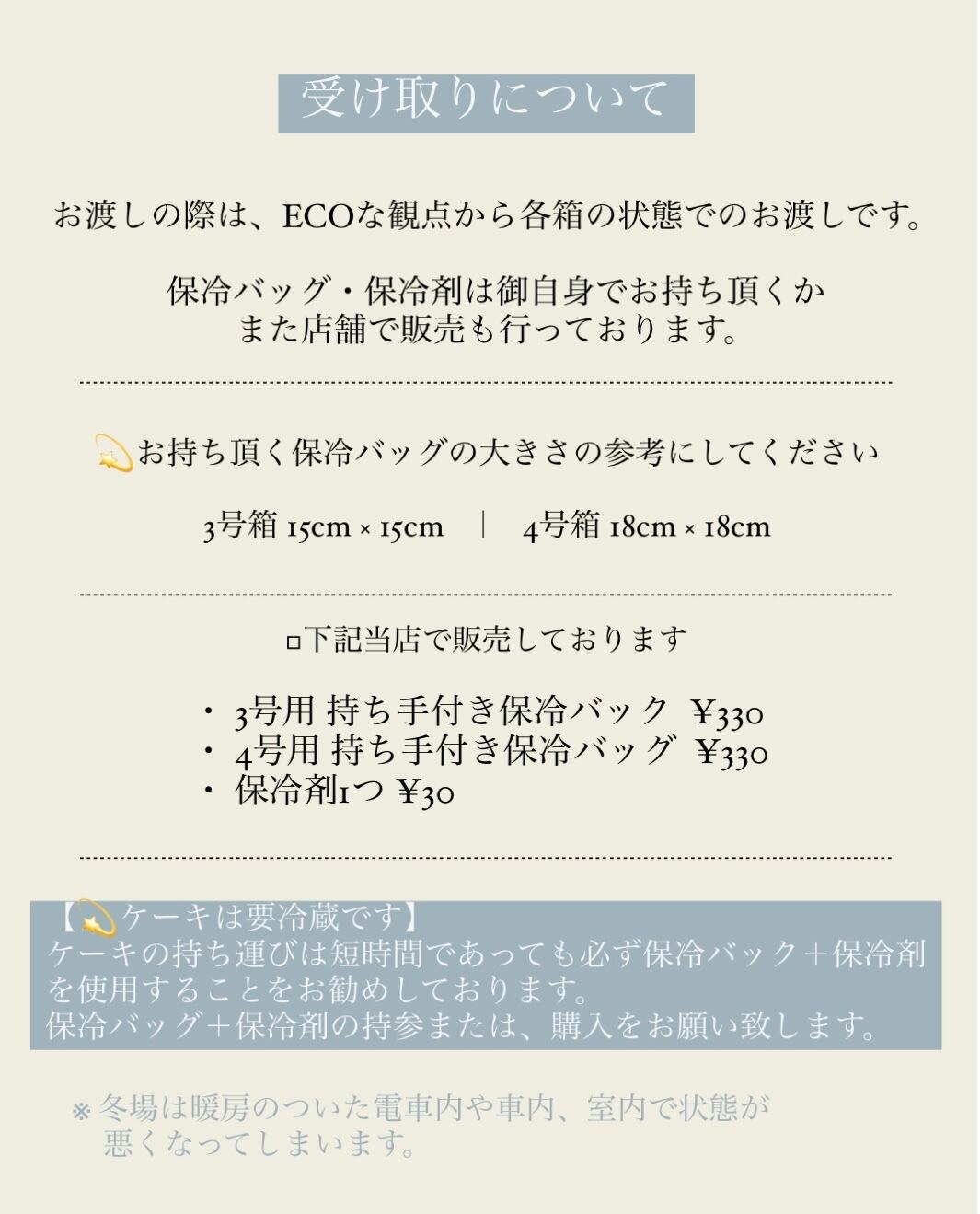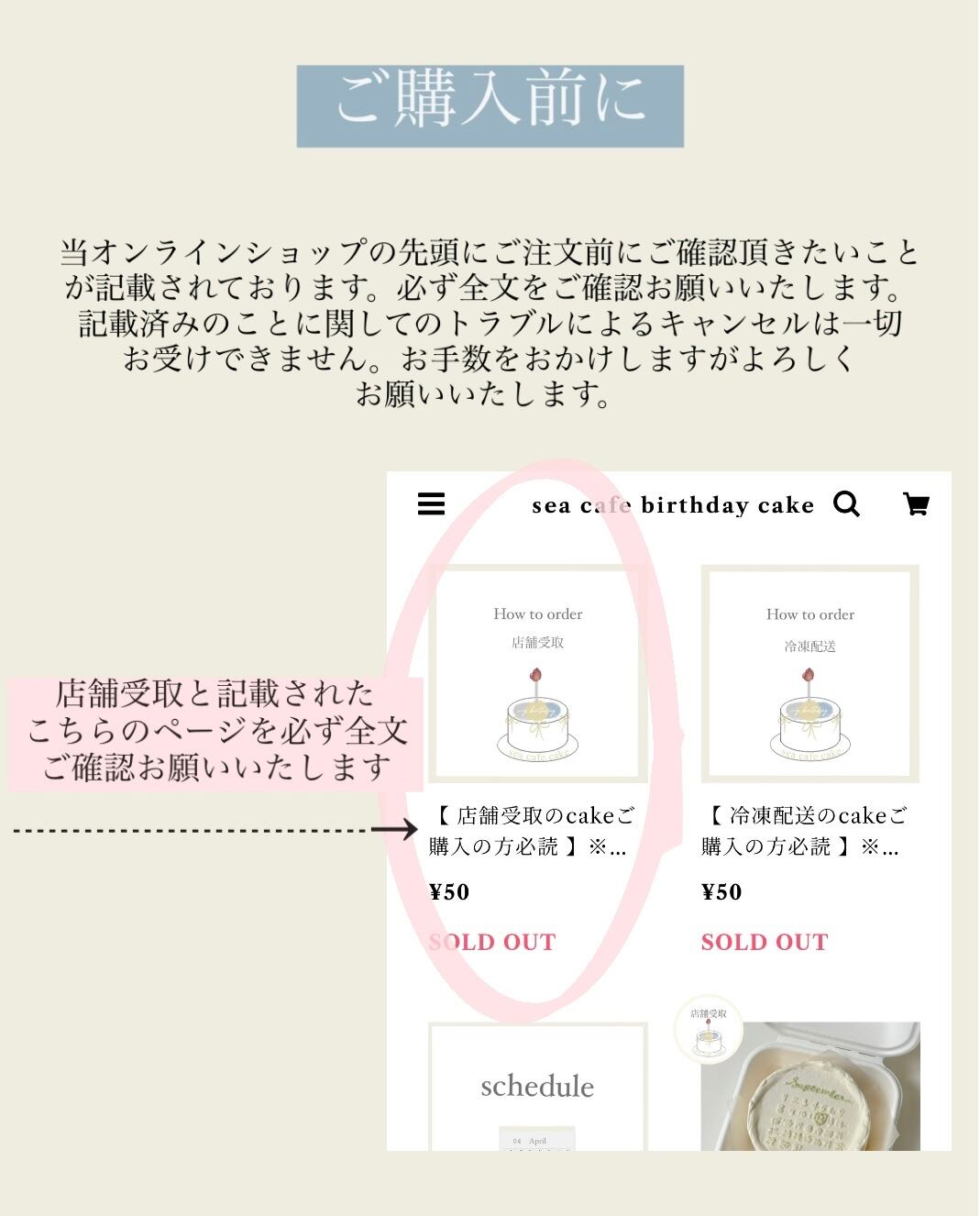 当オンラインショップの中に « 店舗受取のcakeご購入の方必読 ※ご購入前にお読みください » というページがございます。必ずご購入前に全文をご確認お願いいたします。記載済みのことに関してのトラブルによるキャンセルは一切お受けできません。お手数をおかけしますがよろしくお願いいたします。
